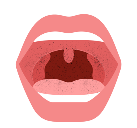 You ask the fire crew to see if they can figure out anything else in the room that may have caused this, letting them know you saw rags and burnt plastic in a pile next to the workbench. They step away to assess, and you continue to check out Marc. You look in his airway and find it as follows.