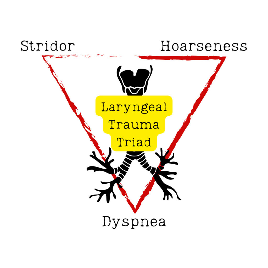 A concerning mechanism with other signs like stridor, hoarseness, and dyspnea (aka the laryngeal trauma triad) raises the index of suspicion for laryngeal injury even further.2 Other signs to look for, but are less specific, are dysphonia, neck pain, and hemoptysis.2
