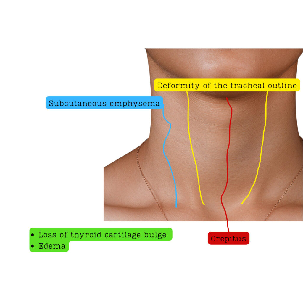 Physical exam findings consistent with this injury are a deformity of the tracheal outline, loss of the thyroid cartilage bulge, subcutaneous emphysema, tenderness, and crepitus across the front of the neck. When there is an injury to the tracheobronchial tree it is common to encounter subcutaneous emphysema and signs of a pneumothorax.2