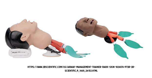The airway simulator industry is finally starting to wake up to the basics of airway management and preparatory positioning. Below, you’ll see an example of an airway head that allows for multi-access positioning, not torquing the neck back and forth. I know when I was taught, it was to take the patient’s forehead and yank it all the way back, hyperextending the neck. There are a couple of problems with that: number one, it pushes the tongue and closes the glottic opening, and it also puts tension on the lateral muscles of the neck, potentially including jugular venous flow, to name a few.