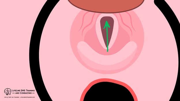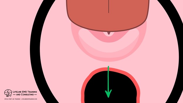 What we find is that by increasing the airflow resistance by actually having the head down versus up, the majority of our air ends up going into the soft, squishy esophagus because that’s now the streamlined path, and what we don’t get is air in and out of the lungs, as seen here.